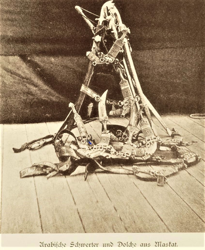 Illustration from "Land und Leute in Deutsch-Ost-Afrika. Erinnerungen aus der ersten Zeit des Aufstandes und der Blokade " by J Wangemann (text) and J. Sturtz (photographs / illustrations) 1890. The above khanjars were conquered by German soldiers during the Arab uprising 1888-1890.